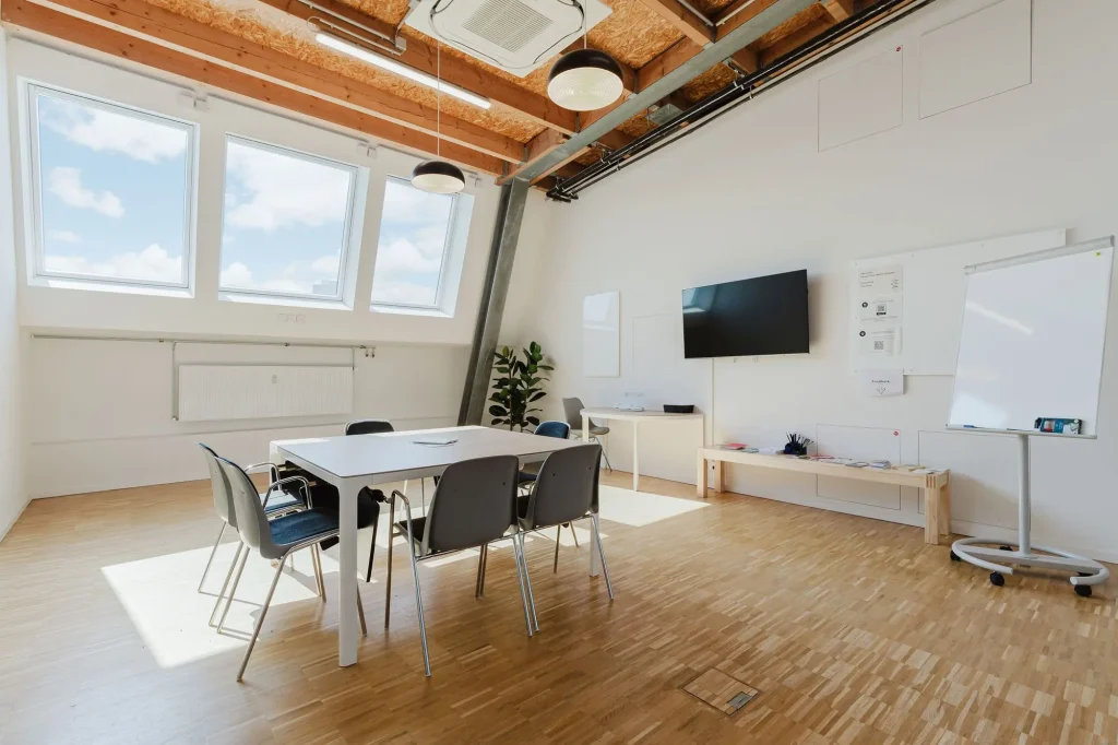 Schöner, hochwertig ausgestatteter, sonniger und klimatisierter Meeting- und Workshopraum in zentraler Lage stunden- oder tageweise zu vermieten.
